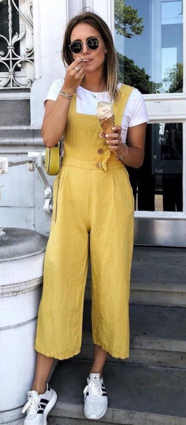 Разнообразные свободные комбинезоны просто созданы для того, чтобы носить их с кроссовками. При этом советую в первую очередь обратить внимание не на деним, а на лен, хлопок и шелк.