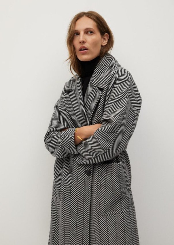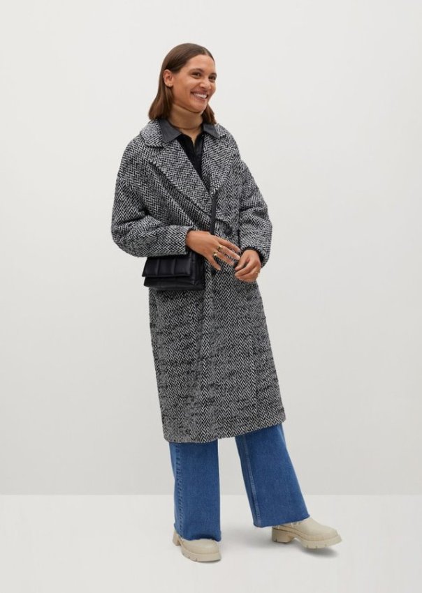 Здесь рисунок елочки более четкий, графичный. Покрой просторный, двубортный с большими накладными карманами.