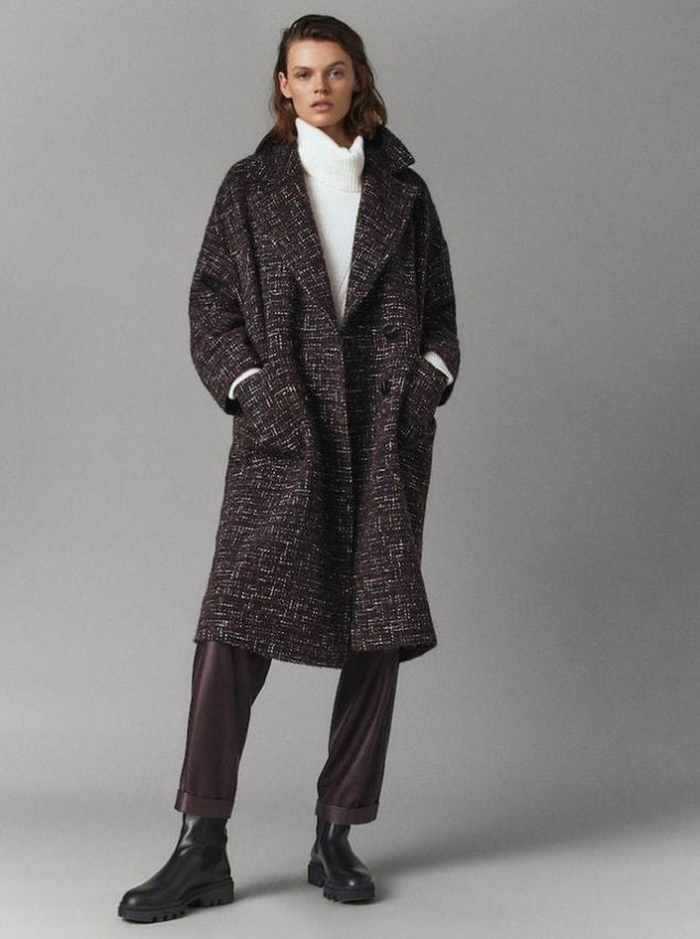 Эта модель имеет серовато-коричневый оттенок. Вы снова видите двубортный покрой. Согласитесь, для демисезонного пальто это лучший вариант, так как этот фасон надежно защищает от ветра и холода. Пройма низко спущена, это дает мягкую, округлую линию плеча. В этом сезоне почти все демисезонные пальто имеют длину миди.