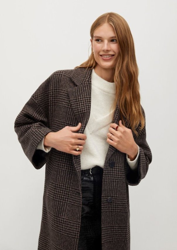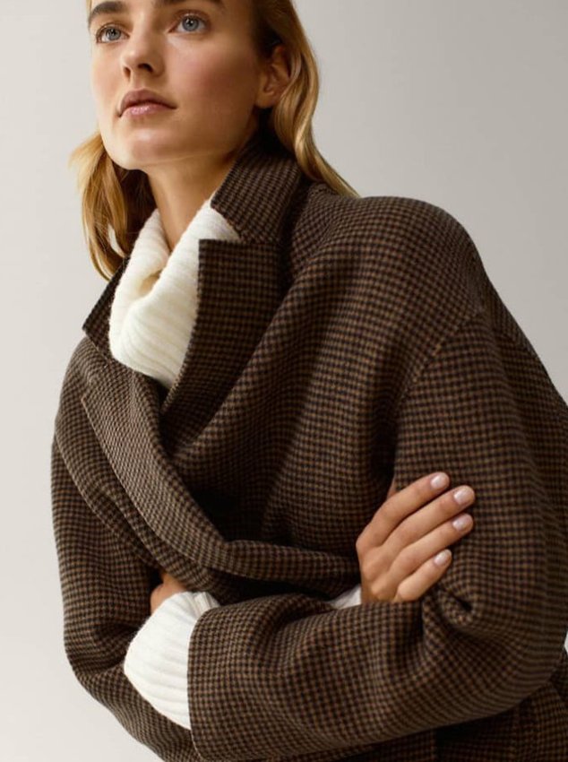 Пальто в мелкую коричневую клетку «пепита». В этом сезоне очень модны материалы мужского типа.
