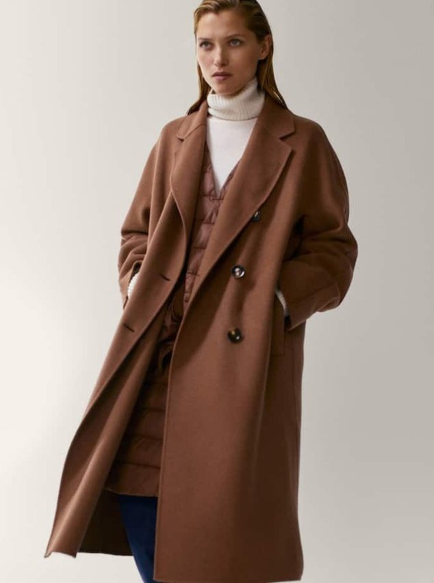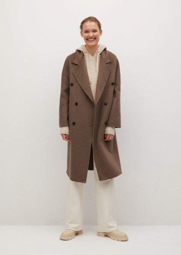 Пальто, представленное ниже, имеет насыщенный оттенок кофе с молоком. Модель отличается двубортным покроем. Дополняют образ большой воротник и лацканы, а также модные черепаховые пуговицы.