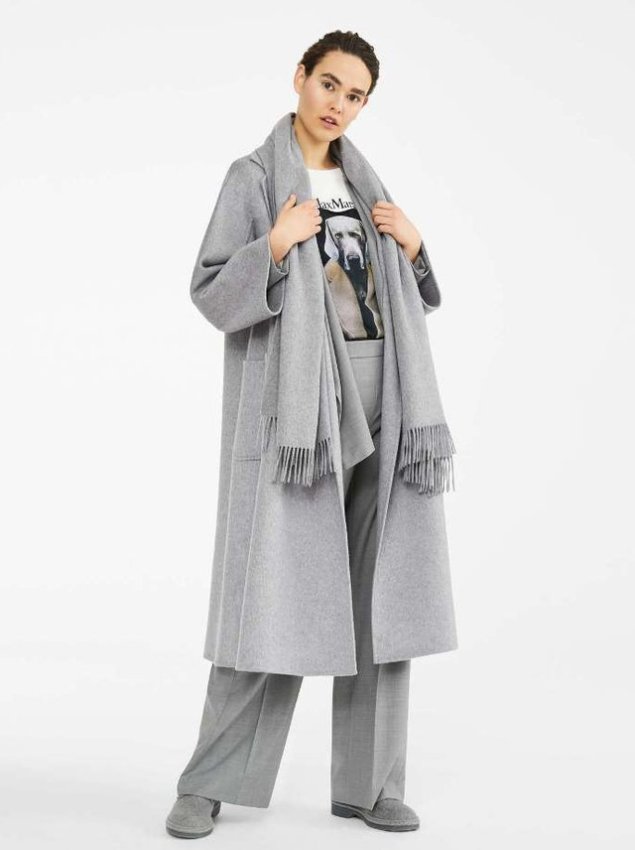 Серые модели тоже любимы многими покупательницами. Это светло-серое пальто оттенка морского камня с длинным шарфом в цвет выглядит исключительно элегантно. Остальные элементы этого комплекта подобраны в той же цветовой гамме.
