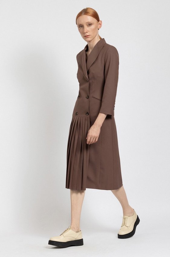 Такое платье, как ниже, идеально подходит для работы, карьеры. Красивый оттенок коричневого цвета, двубортный покрой, небольшая плиссировка спереди — образ выглядит достойно, представительно, вместе с тем в нем есть мягкость, сдержанность.