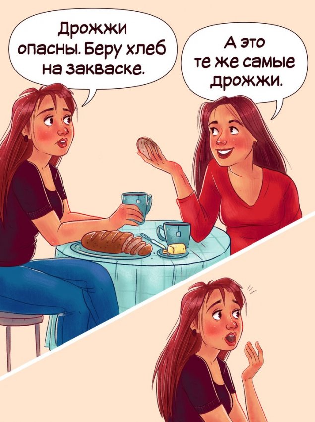 Дефицит знаний не поздно устранить хотя бы при помощи Google. Допустим, подруга пытается «подсадить» на бездрожжевой хлеб. Мол, выпечка на закваске полезна, а магазинная портит организм. Можно напомнить (себе и ей), что закваска в составе имеет грибы Saccharomyces cerevisiae. Как и хлебопекарные дрожжи. Прежде чем верить громким заявлениям маркетологов, стоит заглянуть хотя бы в «Википедию».