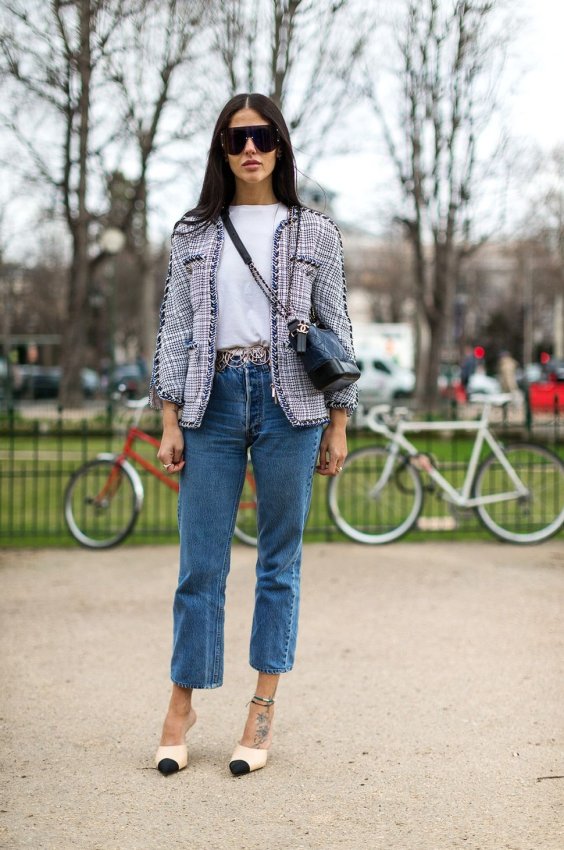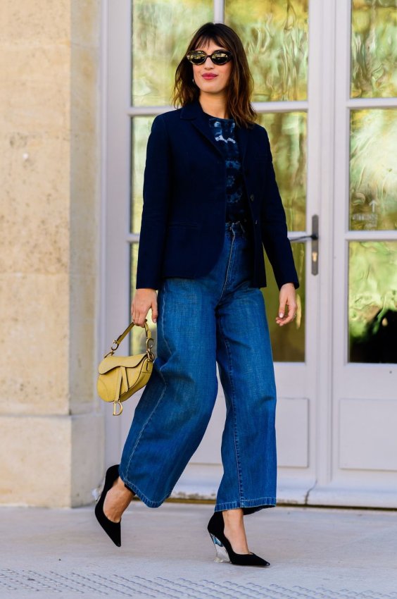 Свободные и широкие джинсы отлично сочетаются с классическим приталенным жакетом. прелесть такого покроя в том, что их можно носить как с каблуками, так и с кроссовками.
