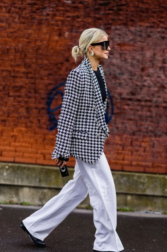 Жакеты в клетку снова с нами. Но в этот раз вместо нейтрального серого лучше выбрать что-то более приметное: куриную лапку, например. Тем более, что она отлично смотрится и с черным, и с белым низом.