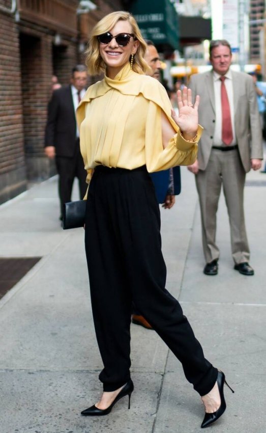 Если мы говорим о длинных брюках — они должны быть прямыми или расклешенными. И опять же — свободное облегание. Часто -заложенные у пояса складки.