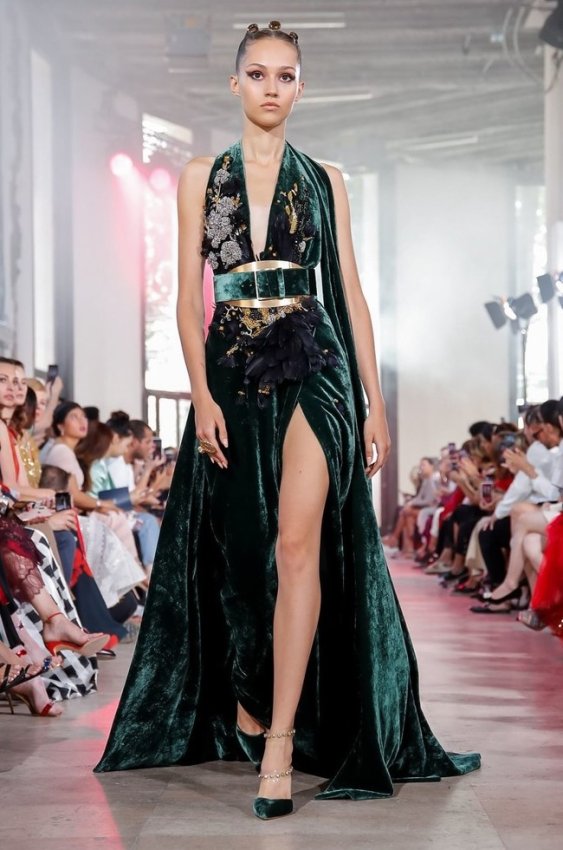 Четкий акцент на талии, сделанный с помощью широких бархатных поясов с золотой пластиной; глубокий разрез; открытые плечи.