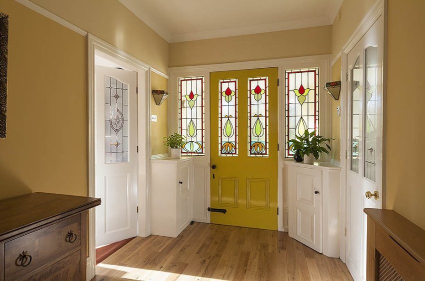 Главный критерий относительно цвета — сама дверь и «прилегающие территории» не должны быть чересчур темными. Следите за тем, чтобы эта зона всегда была хорошо освещена (например, не затягивайте и оперативно меняйте перегоревшую лампочку), отдавайте предпочтение светлым оттенкам: бежевому, светло-желтому, персиковому, коралловому, белому.
