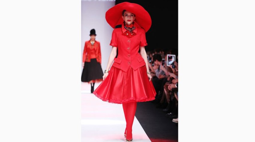 Вячеслав Зайцев по-прежнему предлагает мужчинам и женщинам не забывать, что носить яркое можно и нужно. Главный цвет коллекции — алый красный. Его Зайцев задействует для создания буквально всех вариаций одежды и аксессуаров: пальто, шляпы, платья, блузы, юбки, мужских брюк и даже колгот. Лук total red на подиуме тоже присутствует: приталенный пиджак с коротким рукавом, юбку-солнце, шляпу с широкими полями и красные капроновые колготки дополняет небольшая бабочка на шее того же оттенка.