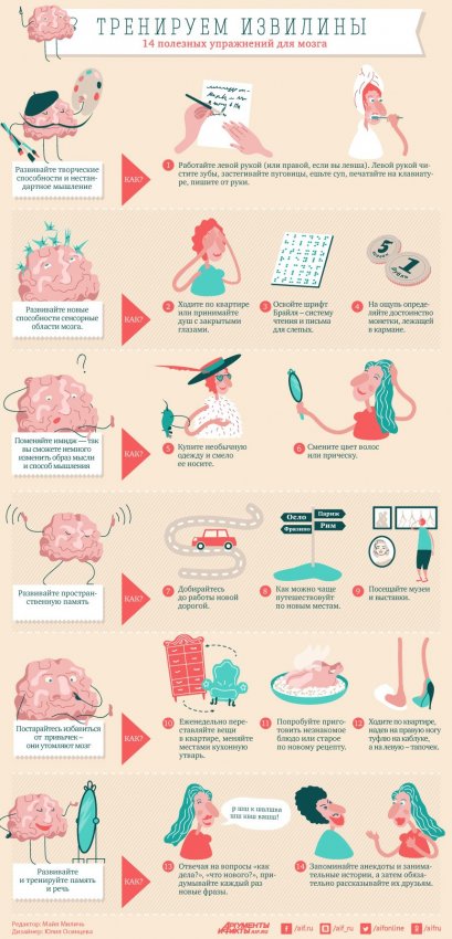 Постарайтесь запустить в себе тягу ко всему необычному при каждой свободной минутке, выполняя домашние повинности, по дороге на работу и в магазин, сидя перед телевизором или у компьютера. Делайте упражнения весело, иронично, с хорошим настроением – мозгу очень нравятся эмоции.