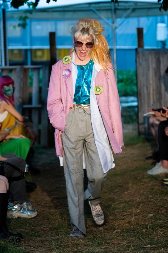 В итоге контрасты были везде: в материалах, крое и акцентах: блузы соседствовали с кожаными брюками, пиджаки с металлизированными топами, спортивные костюмы с грубыми ботинками, а цветочные кардиганы — со скелетами, которыми дизайнер украсил объемные растянутые футболки. Не обошлось и без цепей, яркого мейкапа и причесок в лучших традициях панк-культуры.