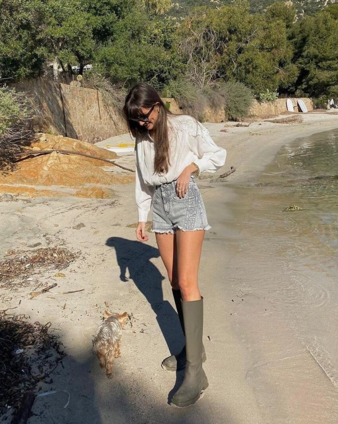 Жаркие, но дождливые дни порой загоняют в угол. Вооружайтесь зонтом и берите пример с француженки Жюли Феррери, которая рифмует мини-шорты из денима с легкой блузой с объемными рукавами и брутальными резиновыми сапогами в духе жокейских. Запомните силуэт и высоту — чуть ниже колен!