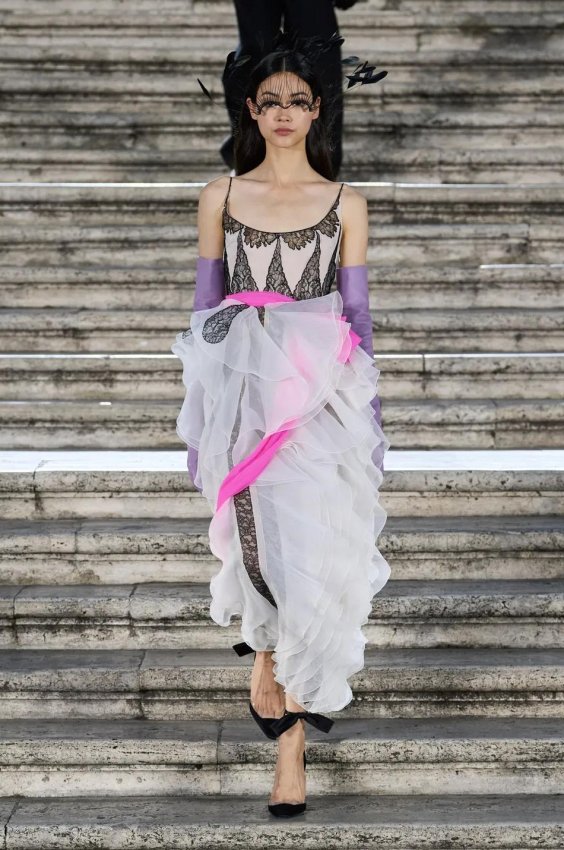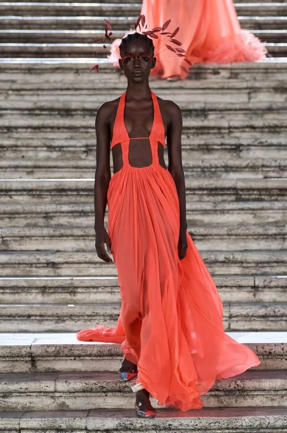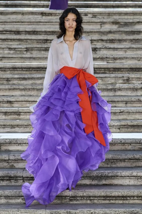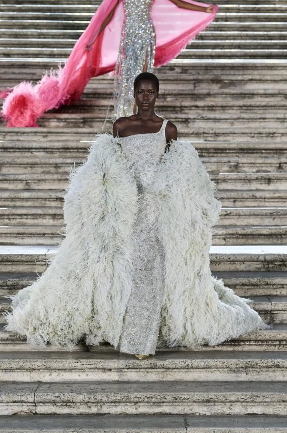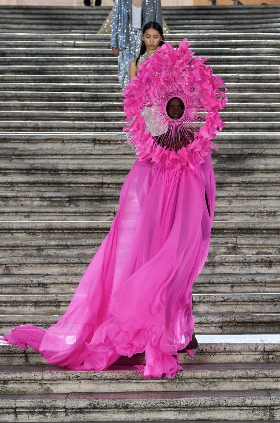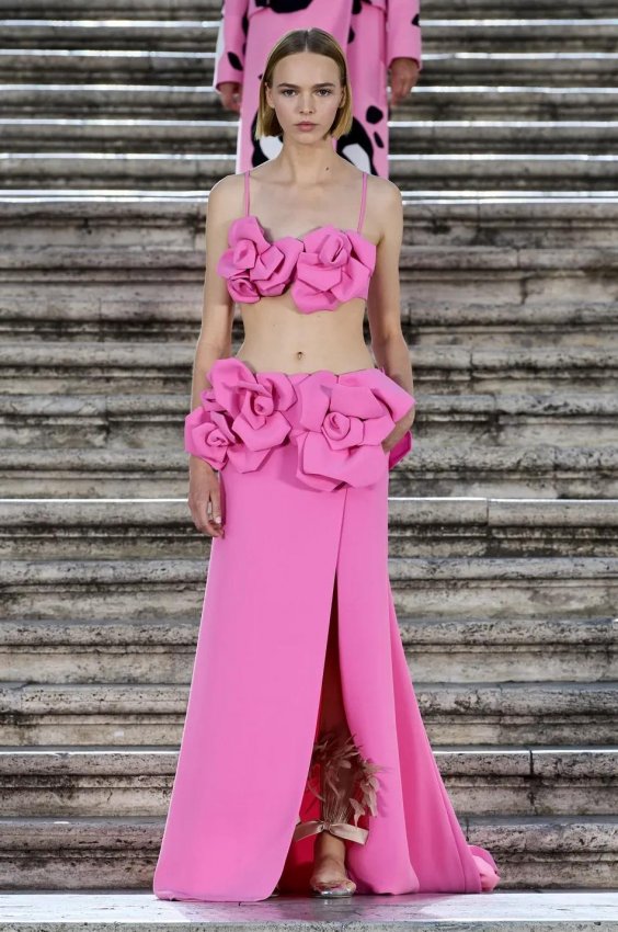 Прошлым вечером в Париже свою новую кутюрную коллекцию для Valentino представил Пьерпаоло Пиччоли — она получила название The Beginning. В этом сезоне дизайнер вновь активно работает с цветами: в прямом и переносном смысле. На подиуме мы увидели буйство ярких красок, а также отсылки к образам живых цветов: модели выходили на подиум в головных уборах-бутонах. Что касается оттенков, то тут Пиччоли показал богатую палитру, которая плавно сменялась вместе с настроением: в начале пышные платья, накидки и костюмы были окрашены в алый, затем появился уже фирменный розовый, который сменился на фиолетовый, кислотно-зелёный и оранжевый. «Отдыхом» от красок стали прозрачные платья и топы серебристого цвета: сияние — ещё один большой тренд коллекции.
