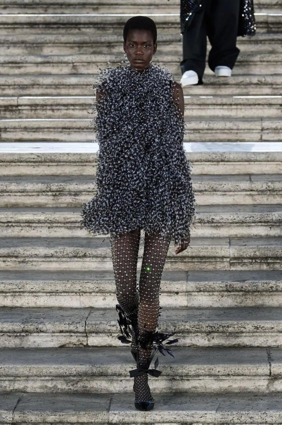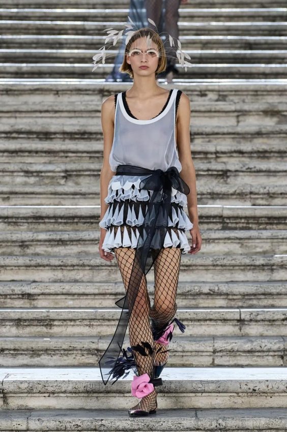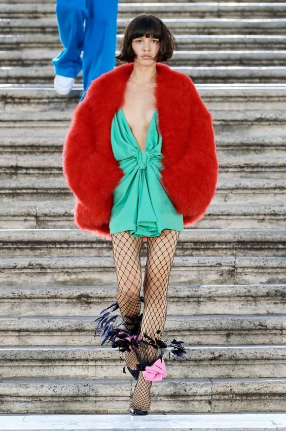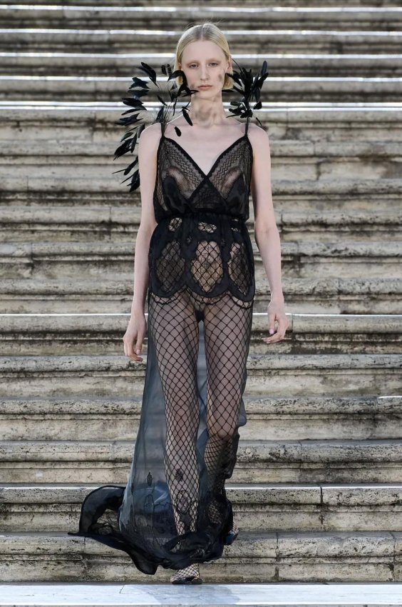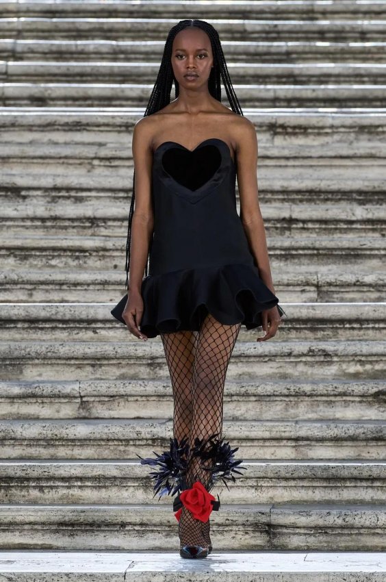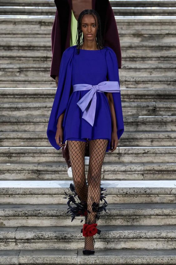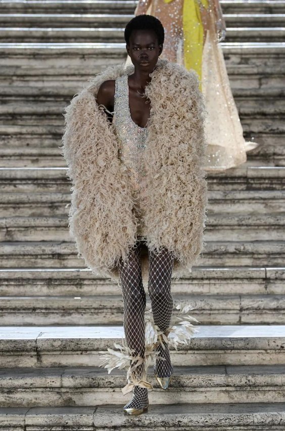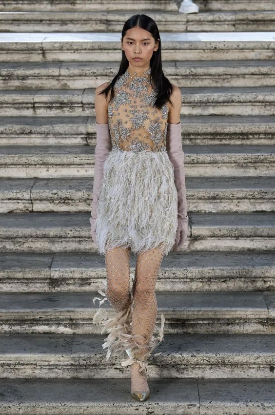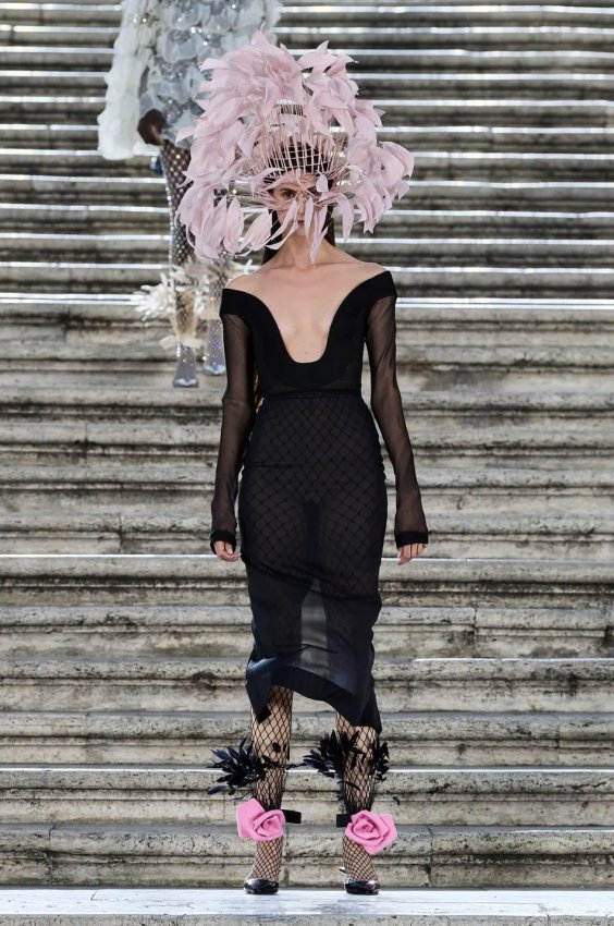 Особого внимания заслуживают детали: босоножки и балетки, украшенные перьями, сетчатые колготки, высокие перчатки и броши в виде роз — определенно, главные мастхэвы сезона.