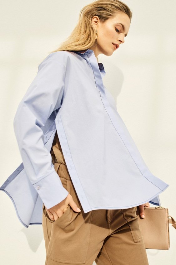 Блуза из хлопка, топ из хлопка, все — Escada; брюки из хлопка, Circolo 1901; сумка из кожи, Aigner; серьги Tiffany Hardware, желтое золото, Tiffany & Co.