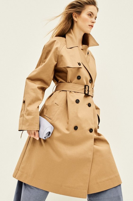 Плащ из хлопкового габардина, Tommy Hilfiger; брюки из хлопка, Lemaire; клатч из кожи, Bree